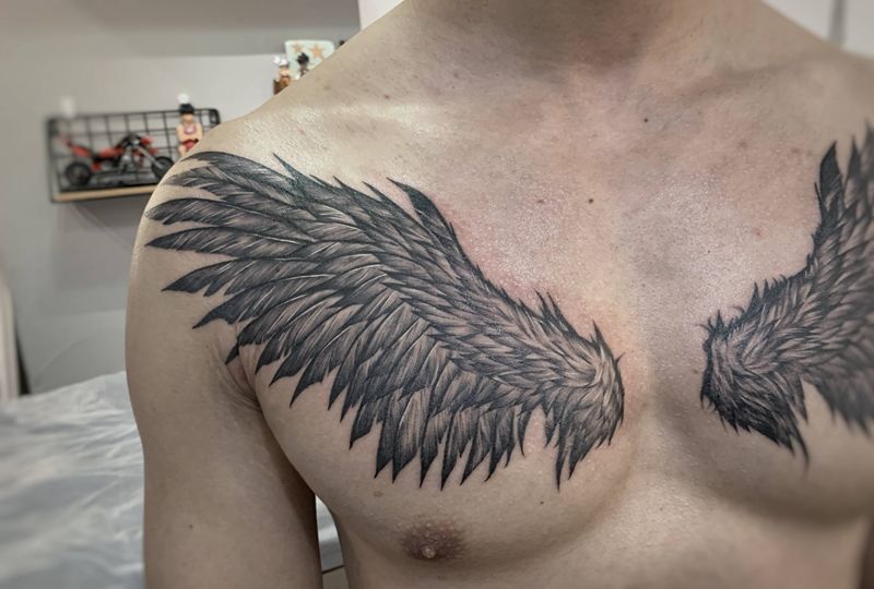 天使之翼纹身图片_肩部胸部新传统欧美写实纹身图案