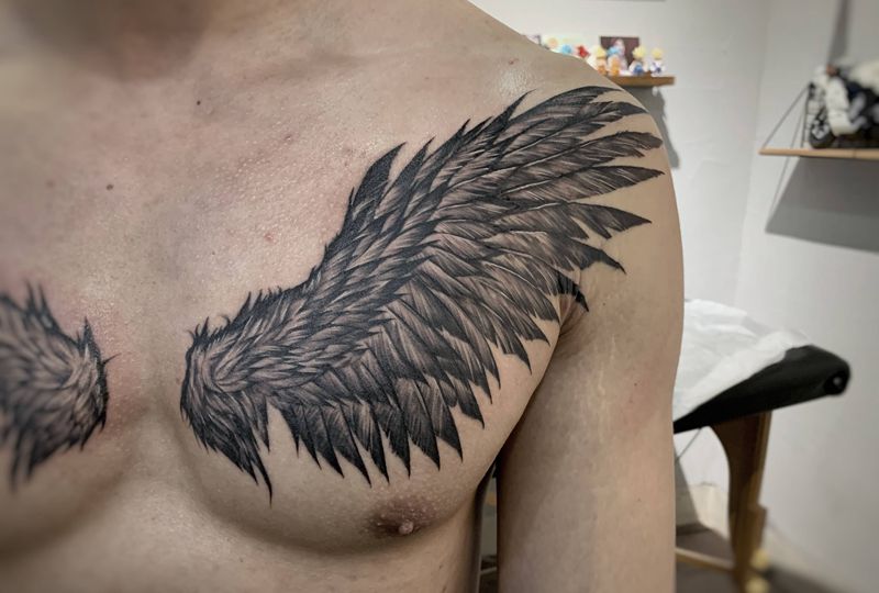 当前位置: 首页 >福建省泉州市纹身店-诚毅刺青纹身图案>天使之翼纹身图片_肩部胸部新传统欧美写实纹身图案