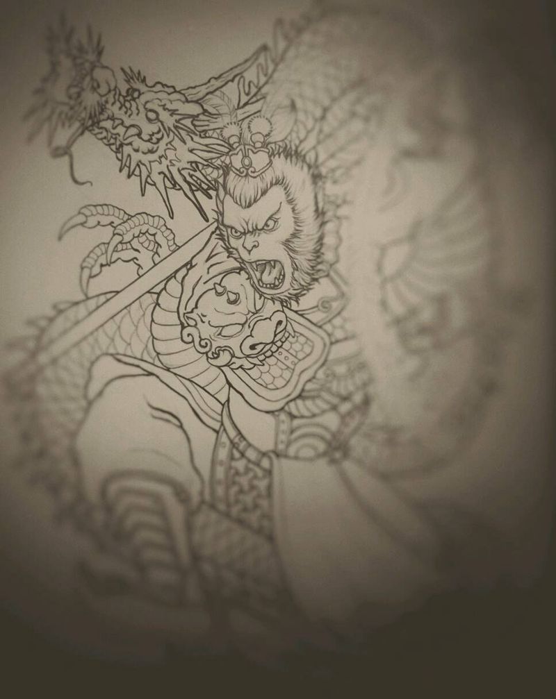 当前位置: 首页 >福建省泉州市纹身店-诚毅刺青纹身图案>猴子线稿完成纹身图片_背部手臂腿部传统习俗写实国画人物鬼神原创纹身图案