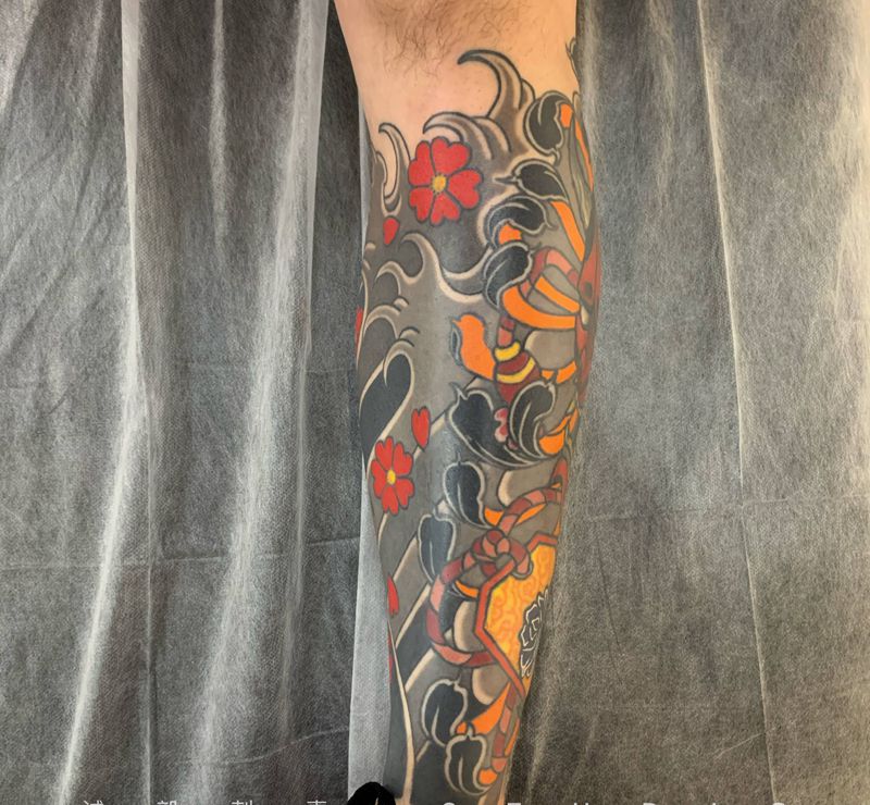 • T网红王老大花腿龙纹身图片_腿部新传统纹身图案