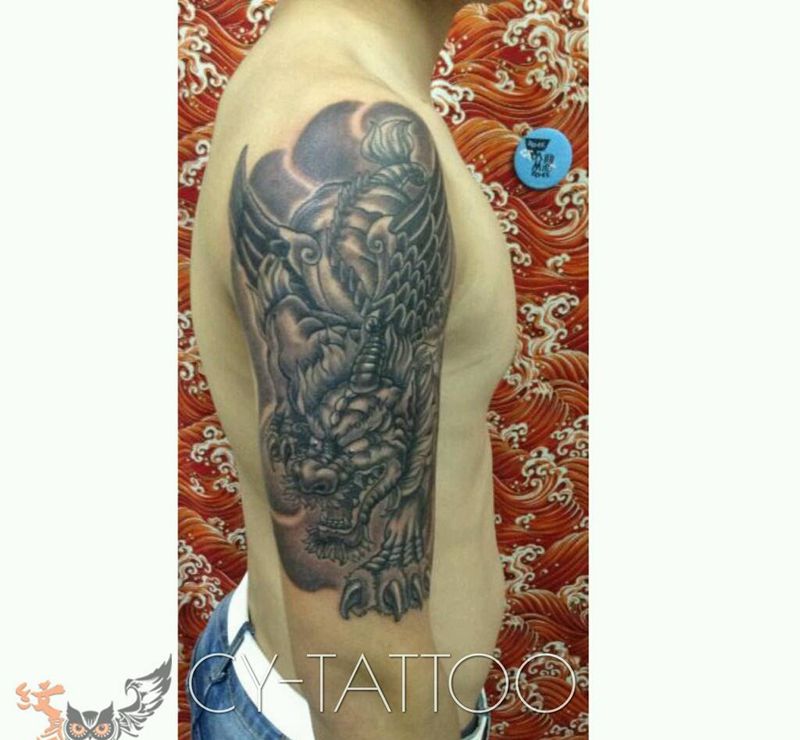 当前位置: 首页 >福建省泉州市纹身店-诚毅刺青纹身图案>原创貔貅纹身图片_肩部手臂传统写实鬼神原创纹身图案
