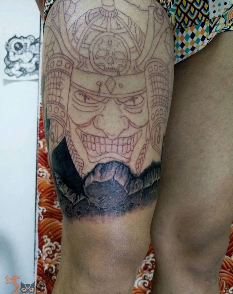 武士石裂纹身图片_腿部欧美传统肖像人物鬼神原创纹身图案