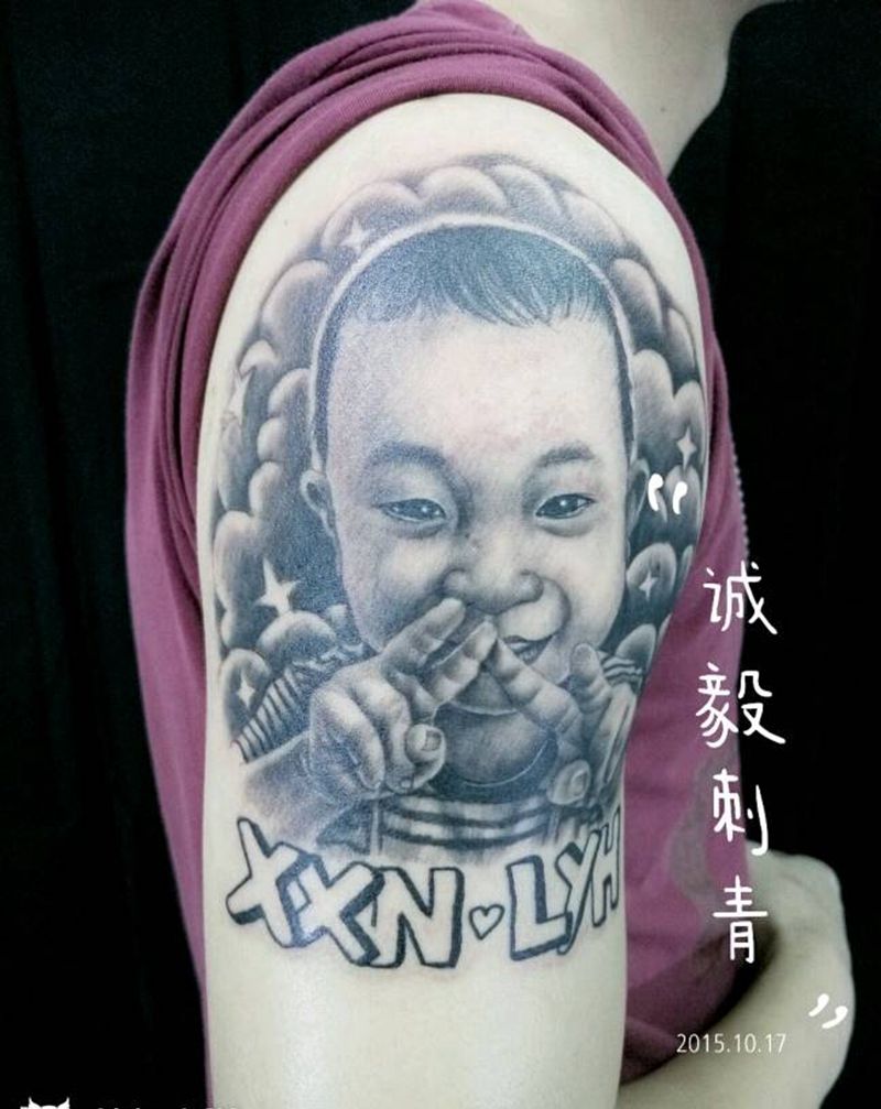 当前位置: 首页 >福建省泉州市纹身店-诚毅刺青纹身图案>儿童肖像纹身图片_手臂手部肖像写实字符人物原创纹身图案