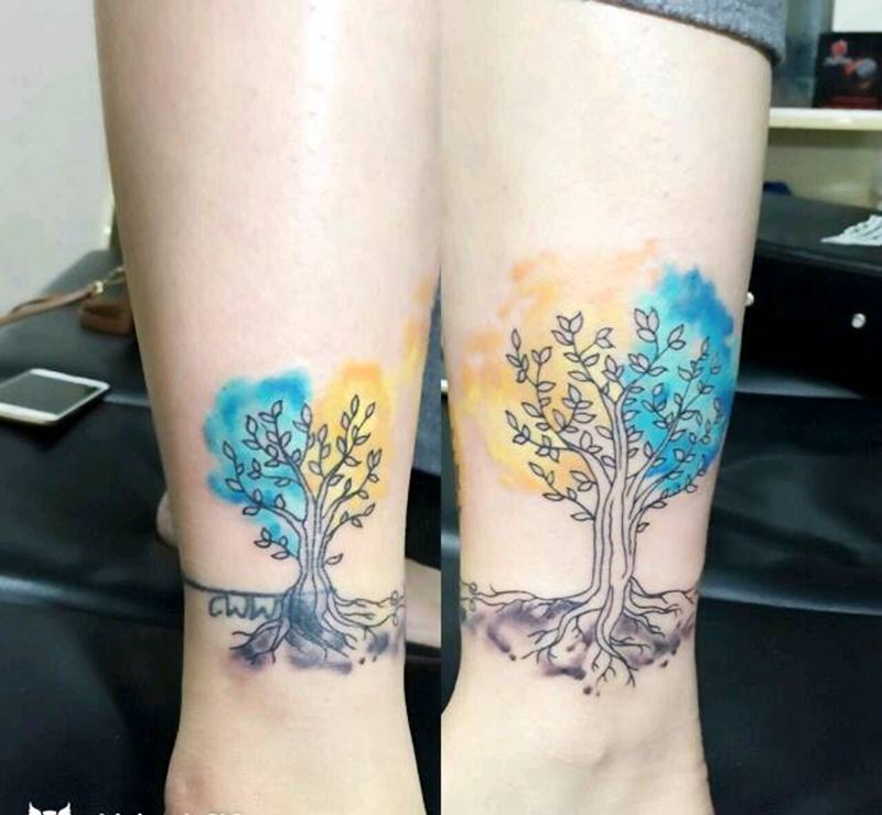 水彩小树纹身纹身图片_腿部脚部欧美清新几何植物原创成品手稿插画纹身图案