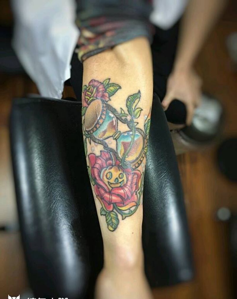 newschool沙漏玫瑰纹身图片_手臂腿部欧美清新植物静物原创成品手稿纹身图案