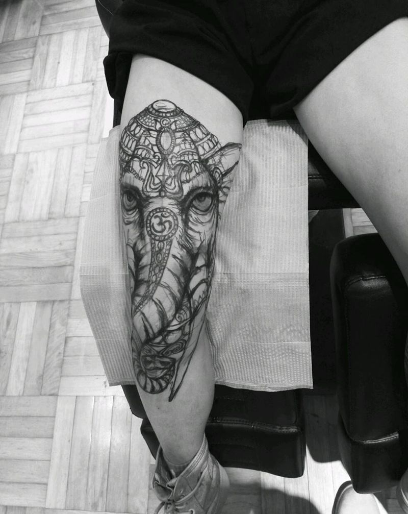 象神纹身图片_腿部欧美传统写实动物人物鬼神手稿插画纹身图案