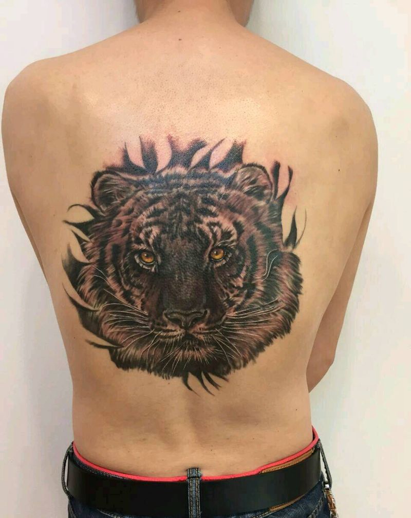 写实黑灰老虎纹身图片_背部欧美传统写实动物原创成品纹身图案