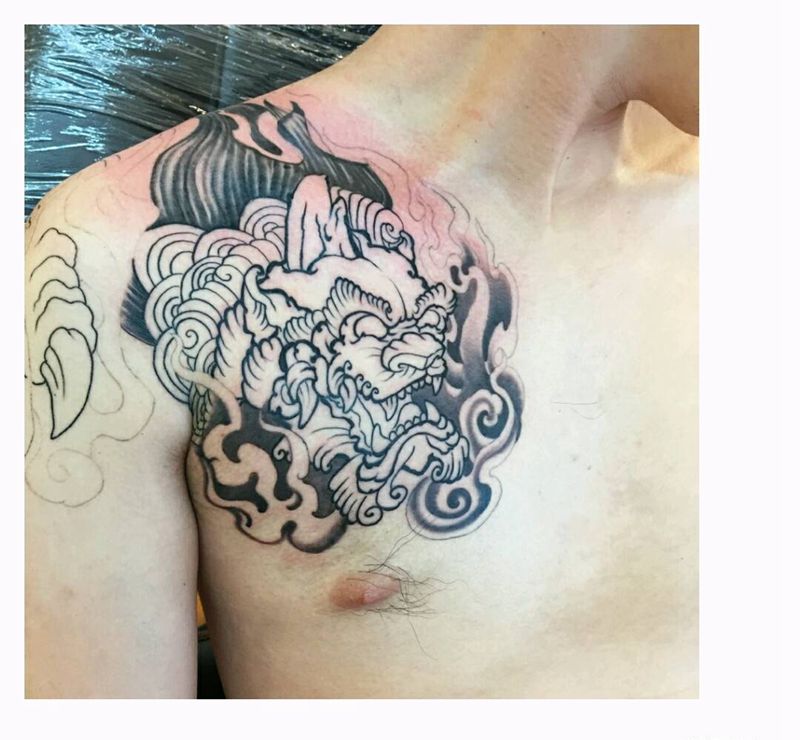 当前位置: 首页 >福建省泉州市纹身店-诚毅刺青纹身图案>小半甲纹身图片_肩部胸部手臂传统动物鬼神原创纹身图案