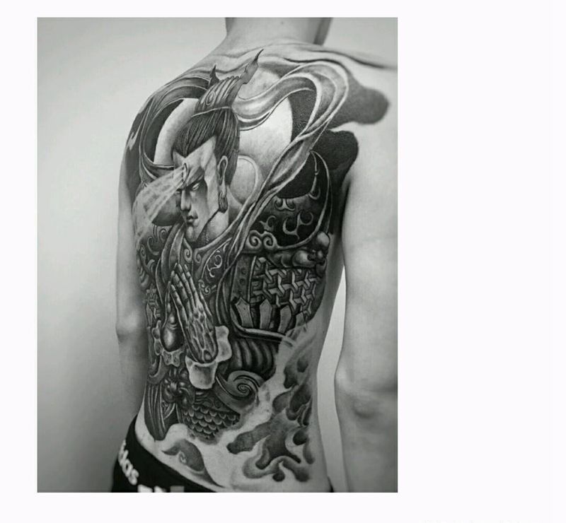 满背二郎神纹身图片_背部传统肖像写实人物鬼神成品纹身图案