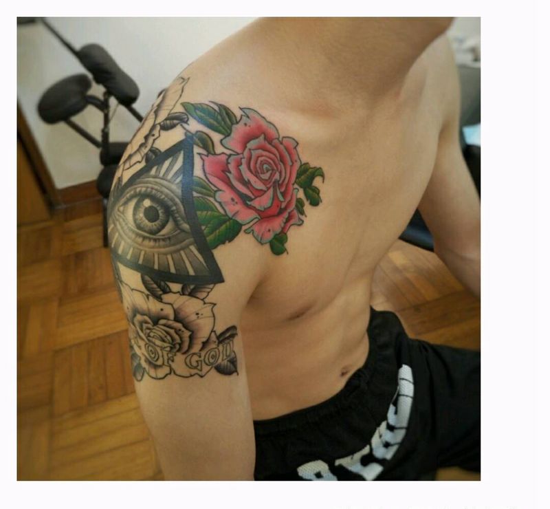 原创欧美纹身拼接纹身图片_肩部胸部手臂欧美写实植物原创成品纹身图案