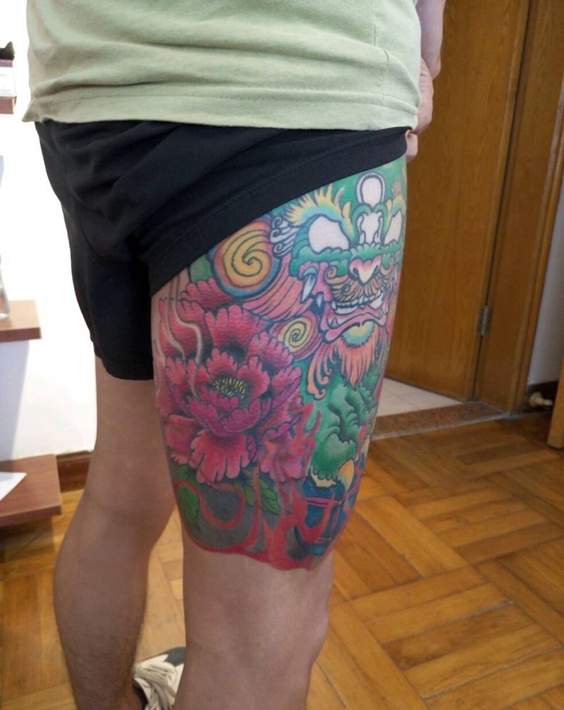 • T网红王老大花腿龙纹身图片_腿部新传统纹身图案