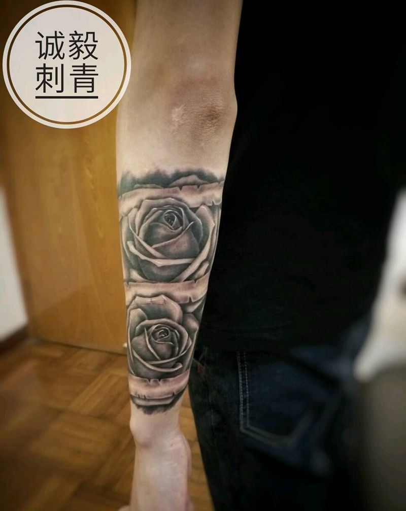 写实玫瑰纹身图片_肩部手臂腿部欧美清新写实植物图腾成品纹身图案