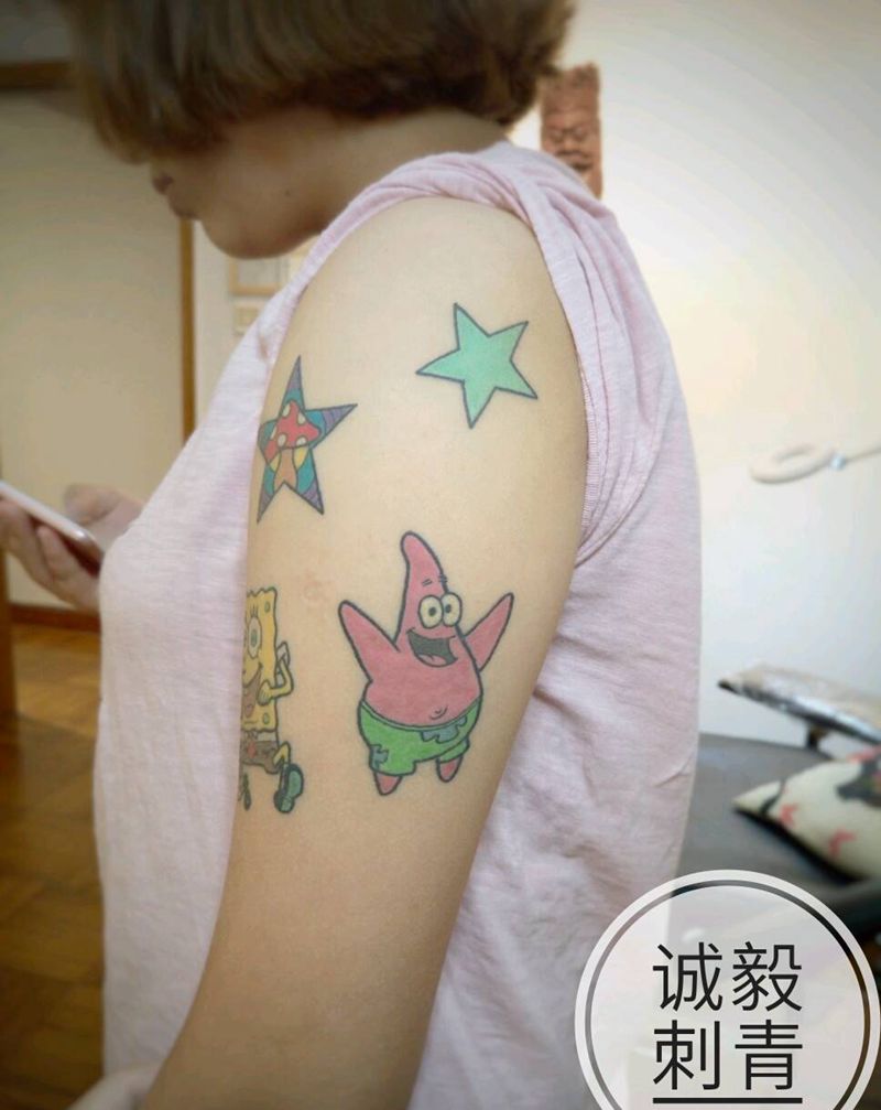 恢复完的海绵宝宝纹身纹身图片_欧美清新几何人物成品手稿插画纹身图案