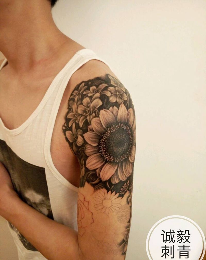 当前位置: 首页 >福建省泉州市纹身店-诚毅刺青纹身图案>全花臂完成四分之一纹身图片_肩部手臂腿部欧美清新写实植物静物原创成品纹身图案