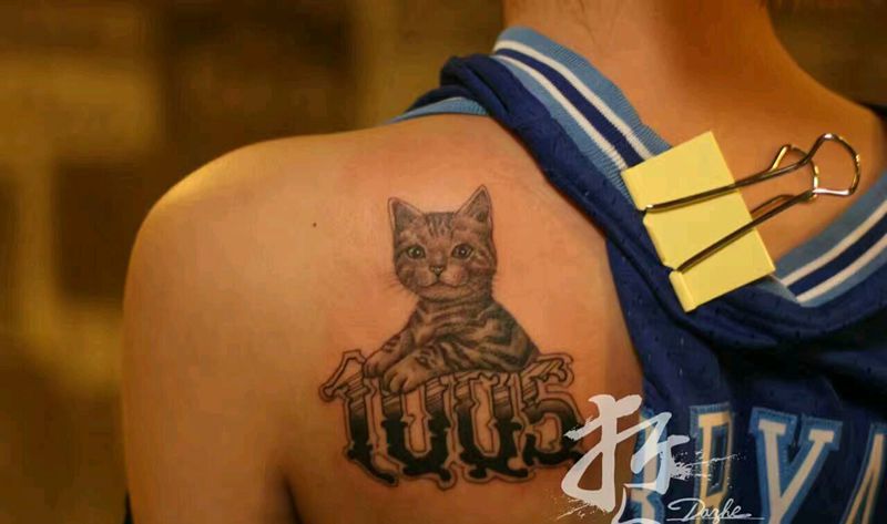 猫咪花体字(原创作品)纹身图片_肩部手臂欧美清新写实几何字符动物原创成品纹身图案