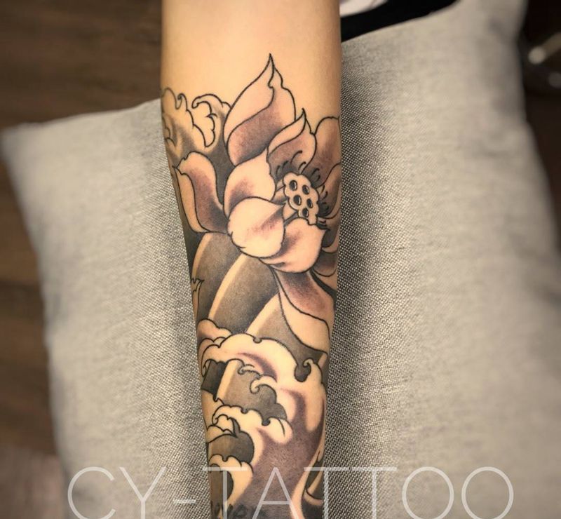 当前位置: 首页 >福建省泉州市纹身店-诚毅刺青纹身图案>原创莲花浪花包小臂纹身图片_手臂腿部传统习俗国画原创植物纹身图案