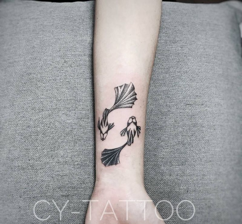 当前位置: 首页 >福建省泉州市纹身店-诚毅刺青纹身图案>双鱼座纹身图片_几何动物植物欧美成品手臂腿部清新写实传统纹身图案