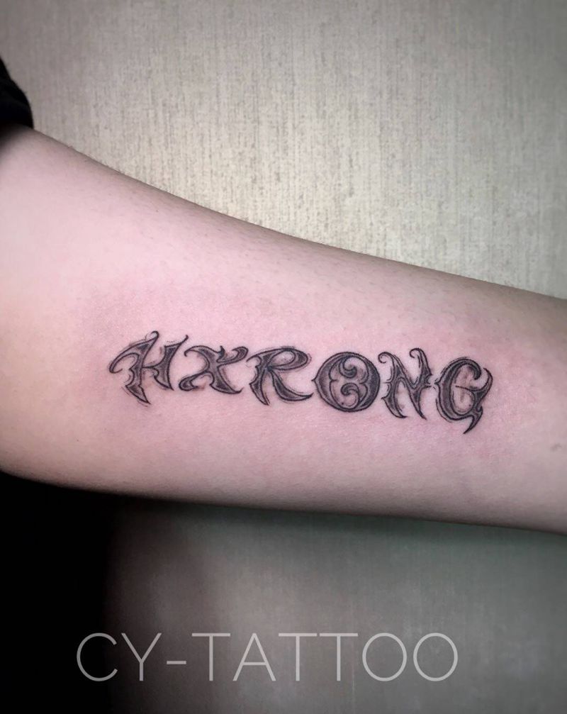 当前位置: 首页 >福建省泉州市纹身店-诚毅刺青纹身图案>阿杰师傅花体英文纹身图片_原创几何字符欧美清新手部成品手臂腿部传统纹身图案