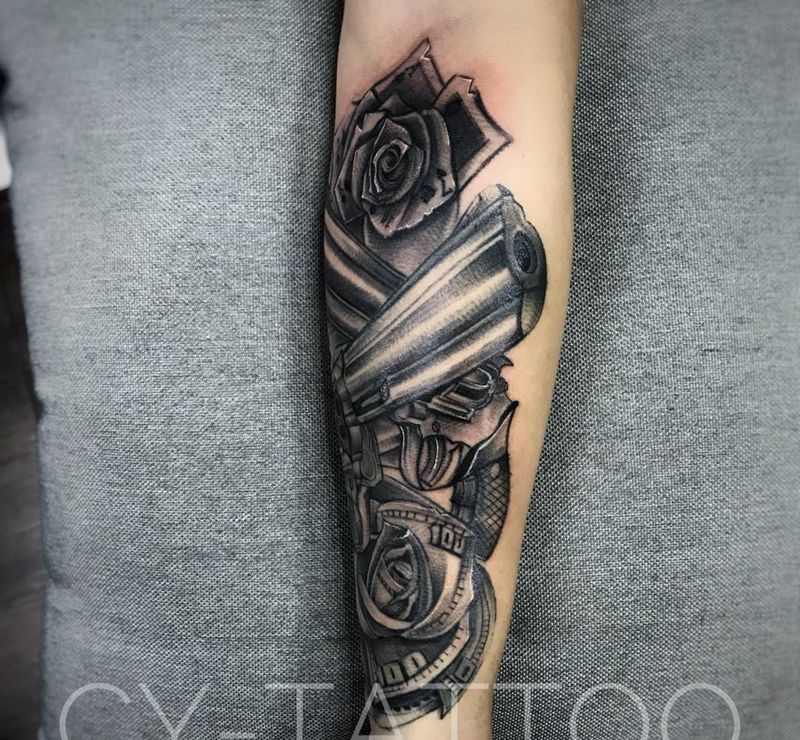枪花玫瑰纹身图片_几何欧美写实清新手臂腿部成品手稿静物植物纹身图案