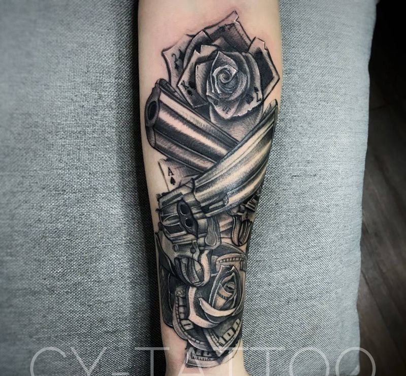 枪花玫瑰纹身图片_几何欧美写实清新手臂腿部成品手稿静物植物纹身图案
