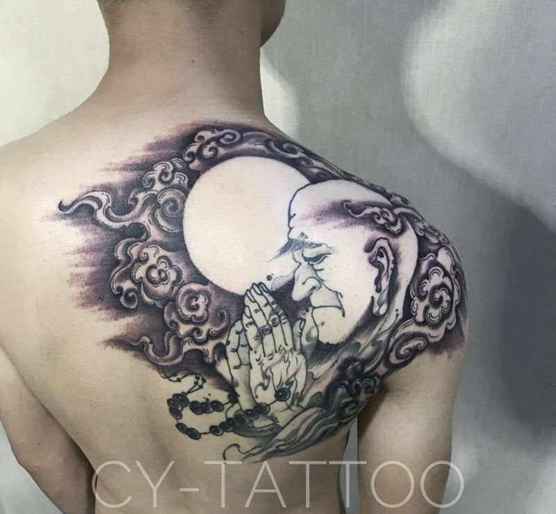 当前位置: 首页 >福建省泉州市纹身店-诚毅刺青纹身图案>原创作品祈祷纹身图片_原创成品国画肖像传统人物肩部背部胸部手臂纹身图案
