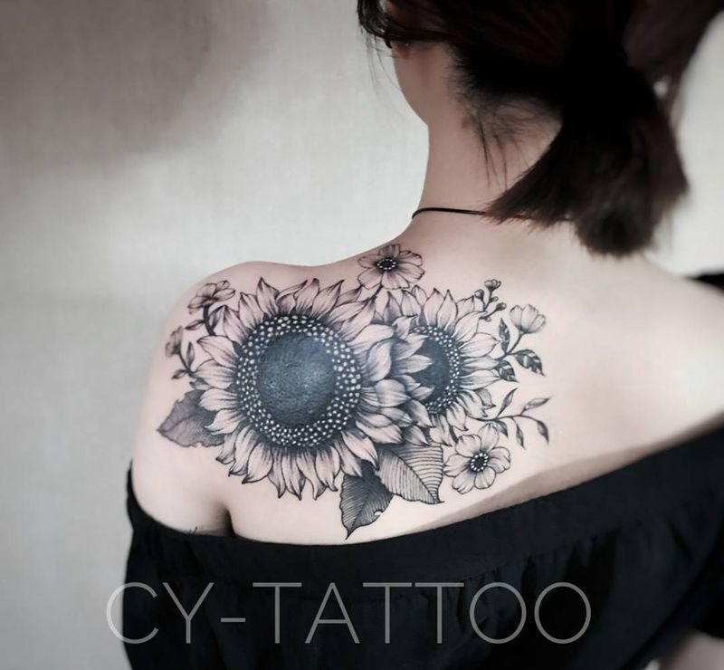 原创向日葵遮盖纹身图片_原创植物欧美清新写实手臂成品背部腿部肩部纹身图案