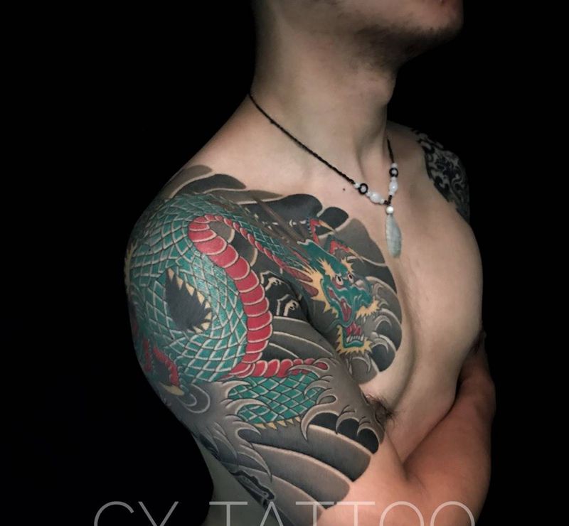 • T网红王老大花腿龙纹身图片_腿部新传统纹身图案