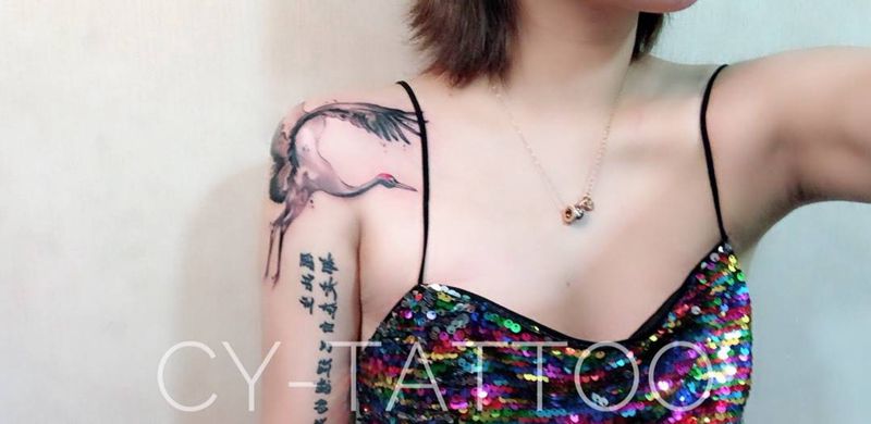 水墨仙鹤纹身图片_肩部手臂水墨新传统纹身图案