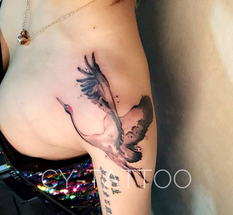 水墨仙鹤纹身图片_肩部手臂水墨新传统纹身图案