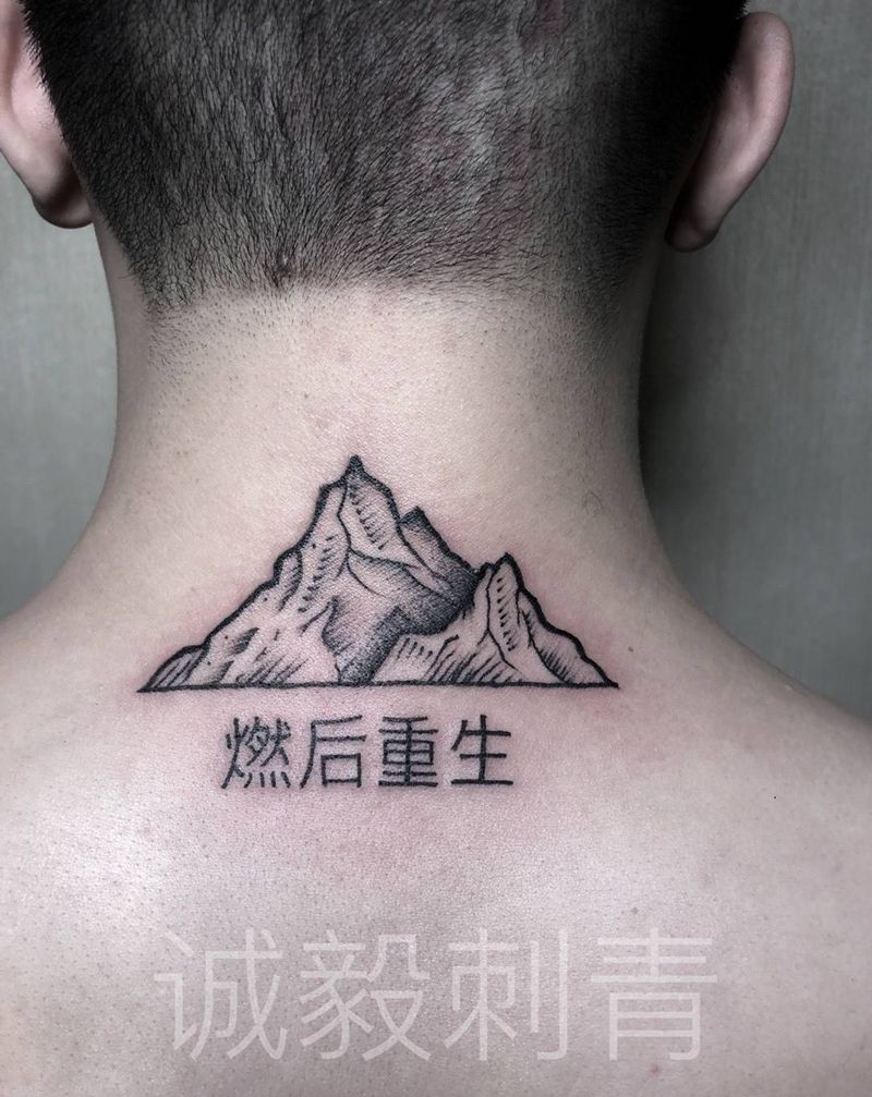 山与汉字纹身图片_肩部手臂点刺水墨纹身图案