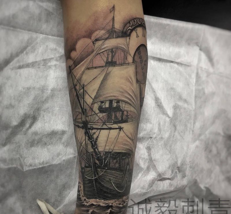 乘风破浪,一帆风顺纹身图片_腿部手臂欧美写实点刺纹身图案