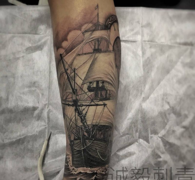 乘风破浪,一帆风顺纹身图片_腿部手臂欧美写实点刺纹身图案