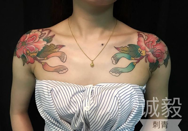 肩花纹身图片_胸部肩部新传统New School纹身图案