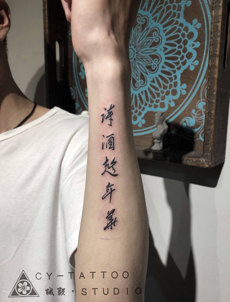 当前位置: 首页 >福建省泉州市纹身店-诚毅刺青纹身图案>书法“诗酒趁年华”纹身图片_手臂腿部花体字水墨纹身图案