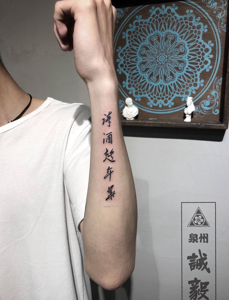 当前位置: 首页 >福建省泉州市纹身店-诚毅刺青纹身图案>书法“诗酒趁年华”纹身图片_手臂腿部花体字水墨纹身图案