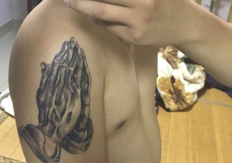 上帝之手修改纹身图片_手臂肩部New School欧美写实纹身图案