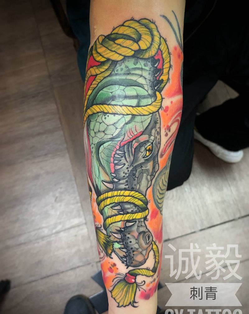 当前位置: 首页 >福建省泉州市纹身店-诚毅刺青纹身图案>newschool鳄鱼纹身图片_手臂腿部New SchoolOld School鳄鱼花臂小臂纹身图案