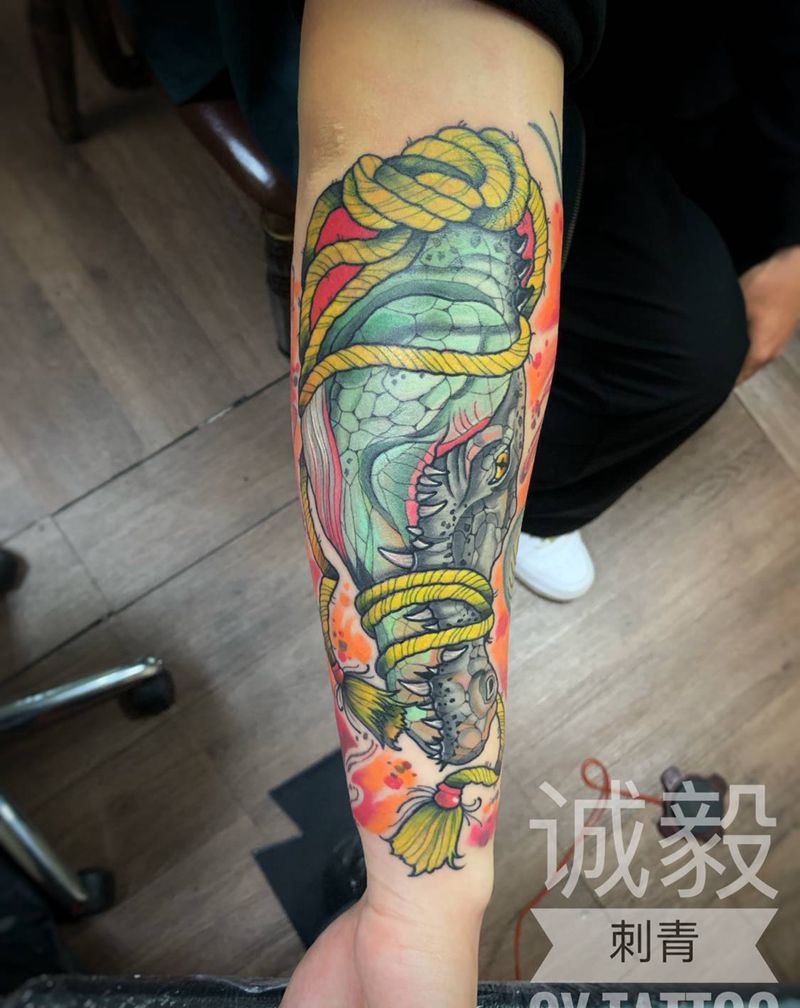 当前位置: 首页 >福建省泉州市纹身店-诚毅刺青纹身图案>newschool鳄鱼纹身图片_手臂腿部New SchoolOld School鳄鱼花臂小臂纹身图案
