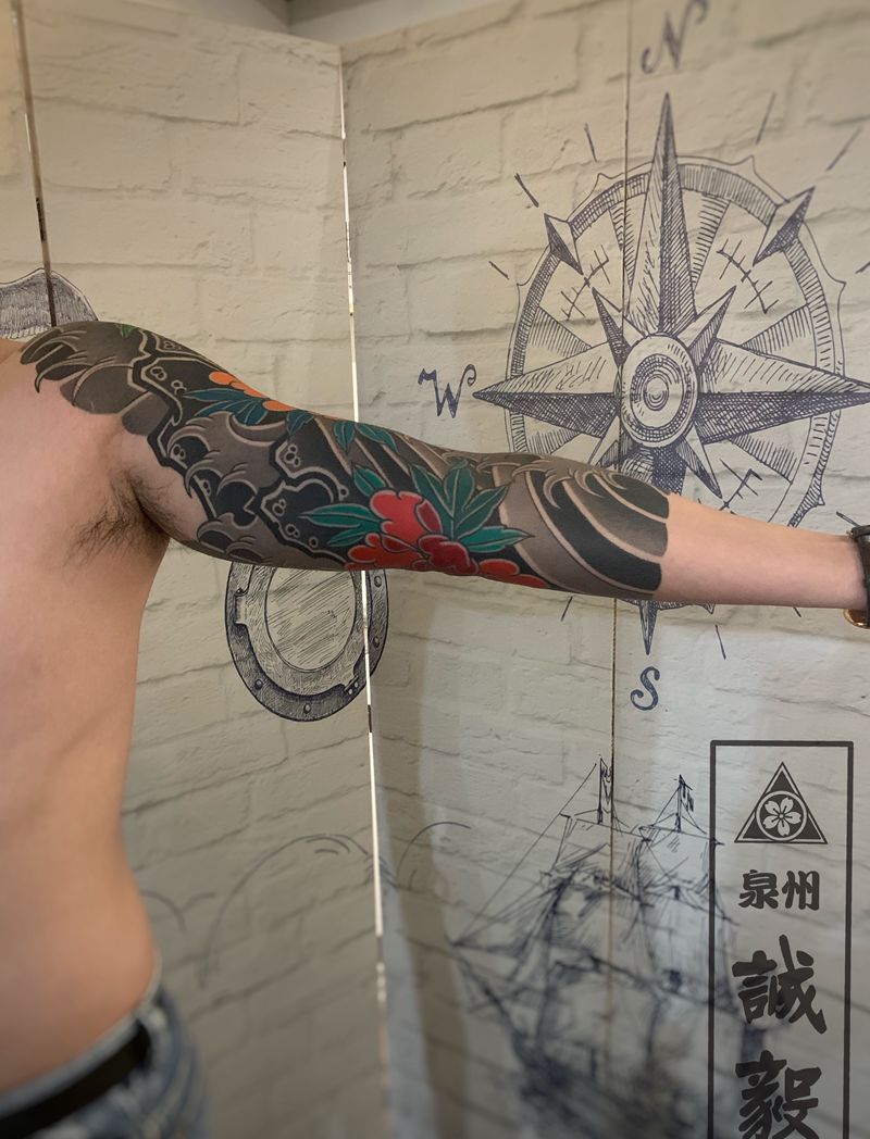 当前位置: 首页 >福建省泉州市纹身店-诚毅刺青纹身图案>原创传统花臂,大臂部分遮盖旧纹纹身图片_手臂腿部新传统老传统纹身图案