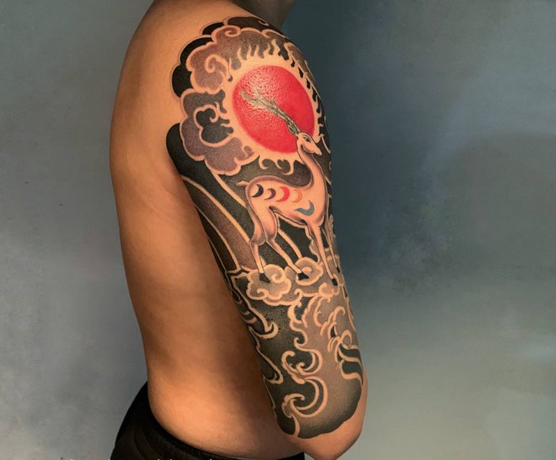 当前位置: 首页 >福建省泉州市纹身店-诚毅刺青纹身图案>九色鹿纹身图片_手臂老传统新传统纹身图案