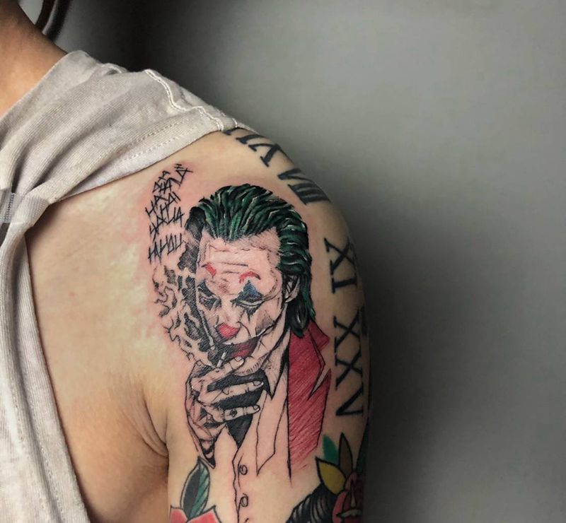 当前位置: 首页 >福建省泉州市纹身店-诚毅刺青纹身图案>小丑纹身图片_手臂肩部New SchoolOld School纹身图案