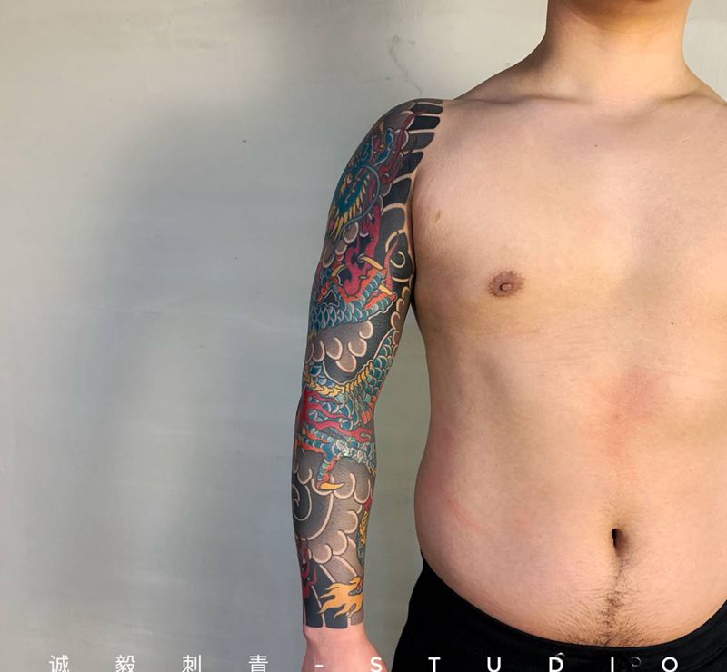 当前位置: 首页 >福建省泉州市纹身店-诚毅刺青纹身图案>原创神龙花臂纹身图片_手臂腿部新传统老传统纹身图案