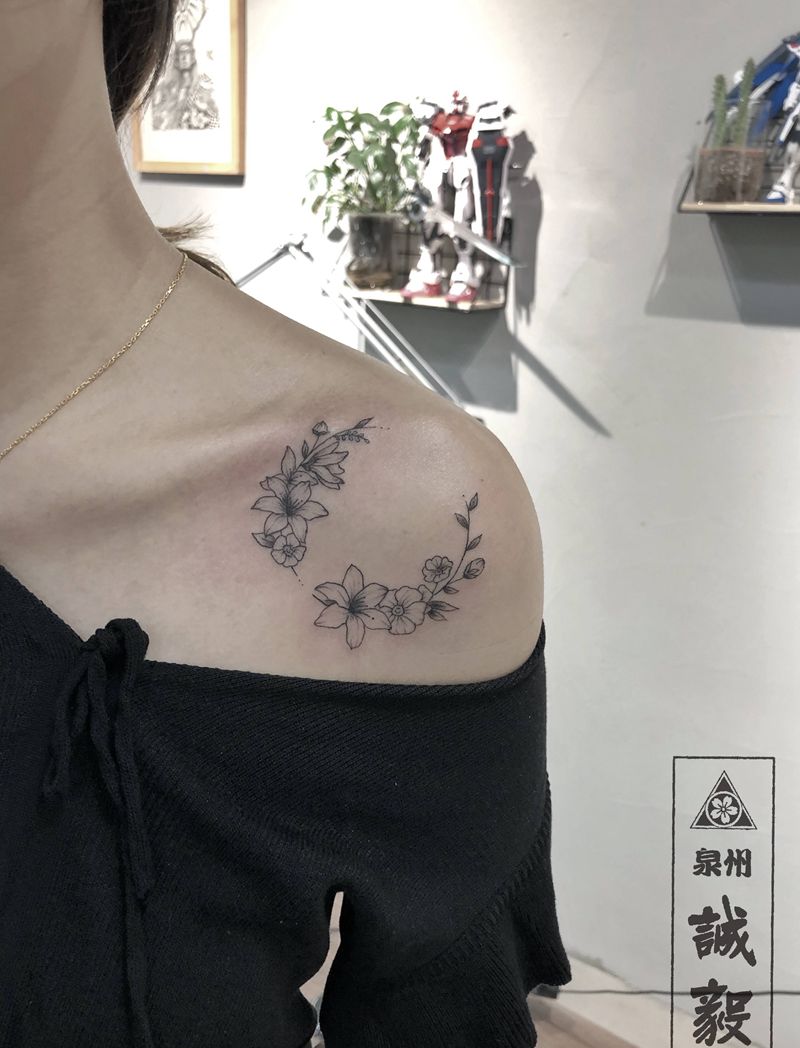 当前位置: 首页 >福建省泉州市纹身店-诚毅刺青纹身图案>肩花月牙纹身图片_肩部手臂New School点刺肩花纹身图案