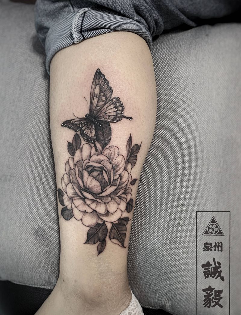 当前位置: 首页 >福建省泉州市纹身店-诚毅刺青纹身图案>素花与蝴蝶纹身图片_手臂腿部点刺欧美写实素花纹身图案