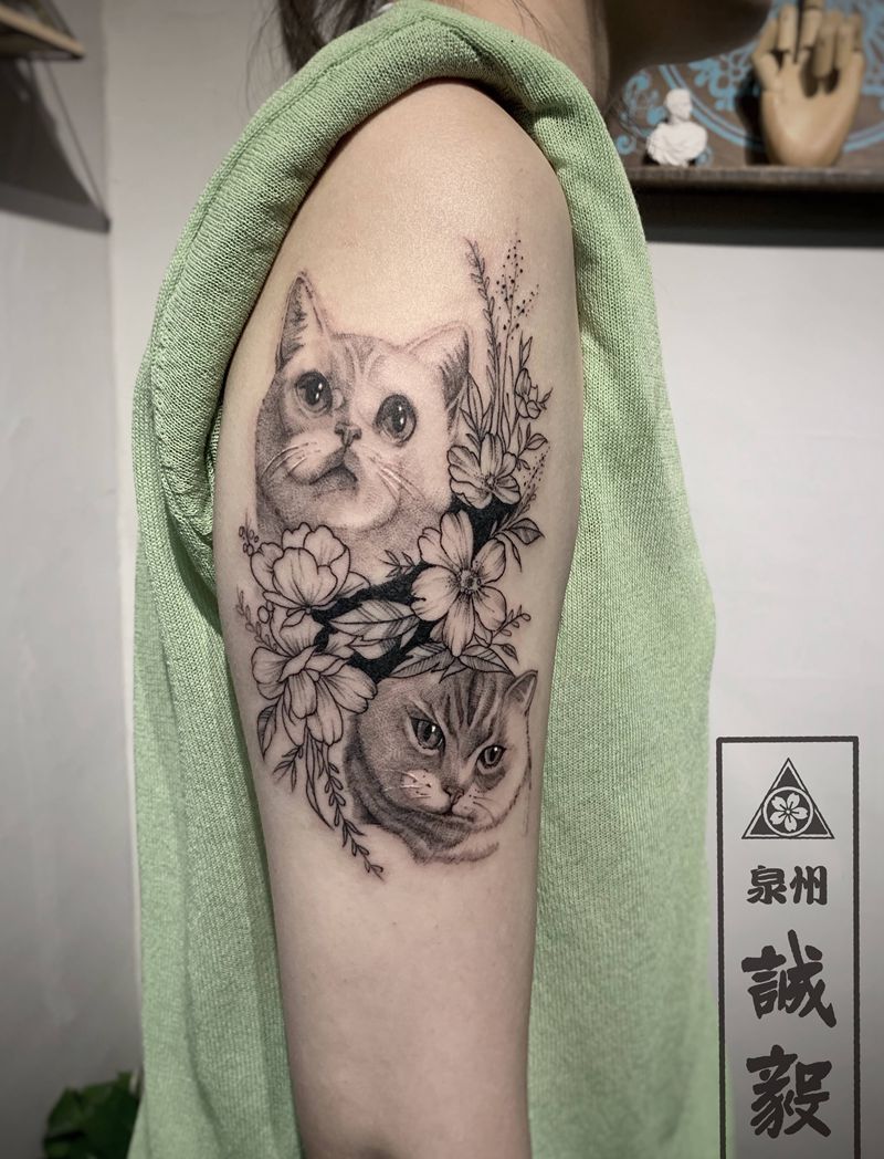 当前位置: 首页 >福建省泉州市纹身店-诚毅刺青纹身图案>两只猫咪纹身图片_手臂腿部欧美写实点刺猫纹身图案