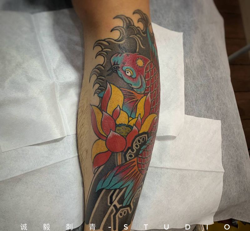 当前位置: 首页 >福建省泉州市纹身店-诚毅刺青纹身图案>老传统小腿锦鲤纹身图片_手臂腿部老传统新传统纹身图案
