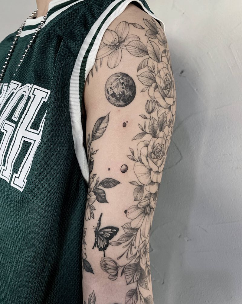 素花花臂纹身图片_手臂肩部欧美写实New School纹身图案