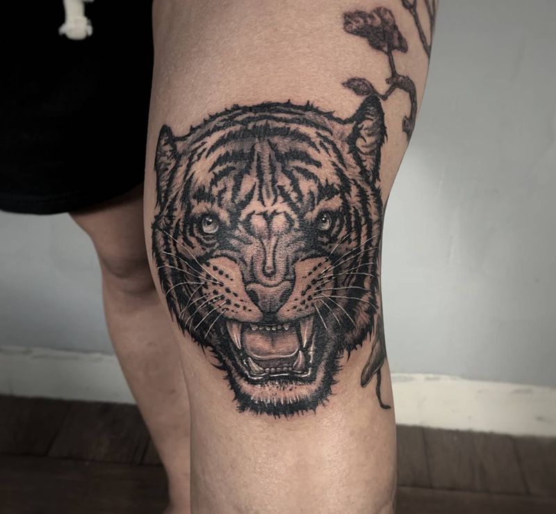 当前位置: 首页 >福建省泉州市纹身店-诚毅刺青纹身图案>膝盖老虎纹身图片_腿部手臂欧美写实新传统纹身图案