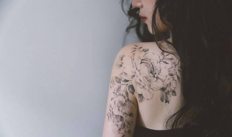 素花买家秀纹身图片_手臂肩部点刺纹身图案
