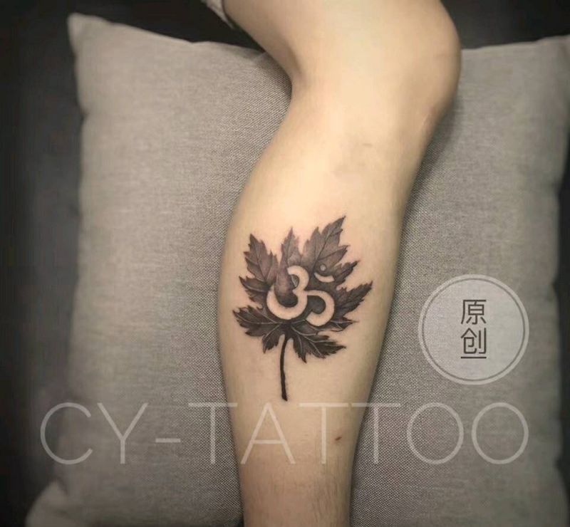 原创枫叶纹身图片_腿部清新写实植物静物图腾原创成品纹身图案